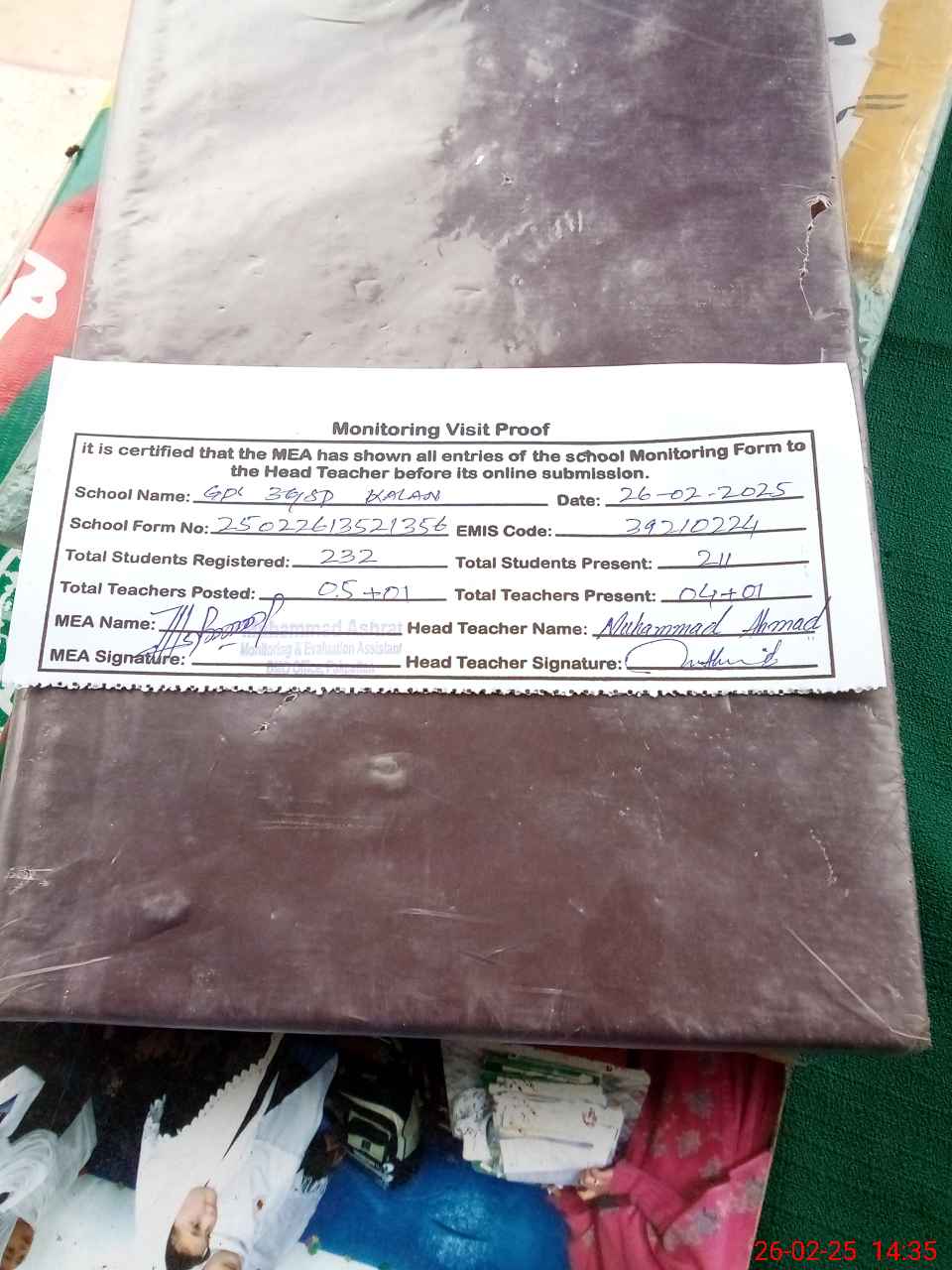 | Attendance Register | Head Teacher | MEA with School | Visit Proof |