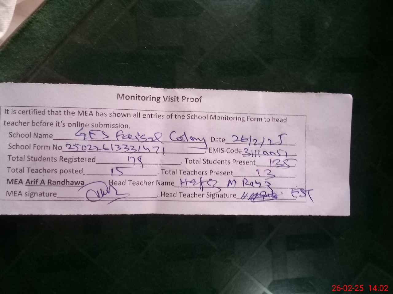 | Attendance Register | Head Teacher | MEA with School | Visit Proof |