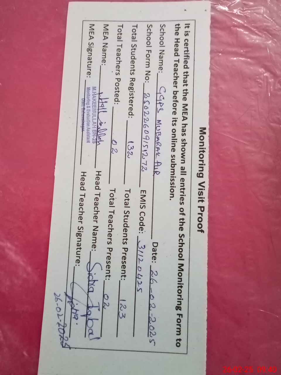| Attendance Register | Head Teacher | MEA with School | Visit Proof |