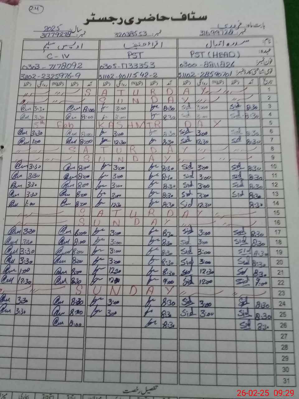 | CNIC | Full Name | Designation | R/C | Absence During Last Calender Month |