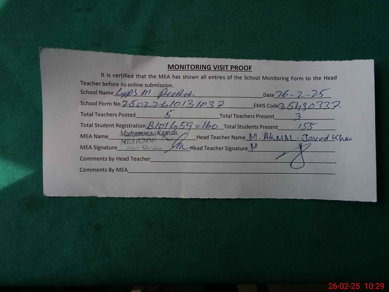 | Certified that this School was Inspected by the Undersigned MEA/DMO Today and the Information Stated Above is as Per Record. | |||||