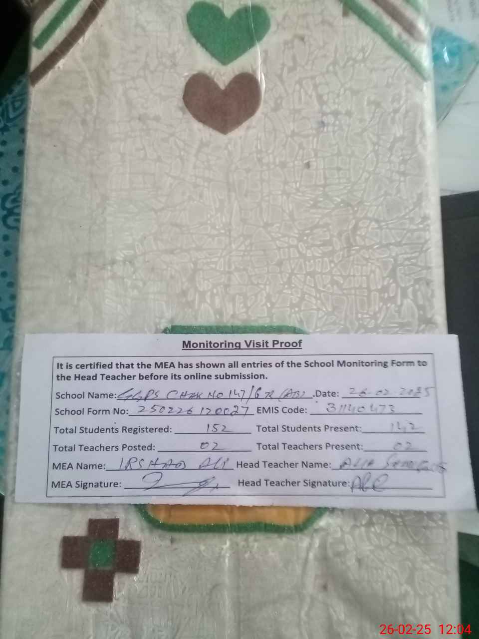 | EMIS Code: 31140473 | Name of School: GGPS CHAK NO. 147/6-R W | |||