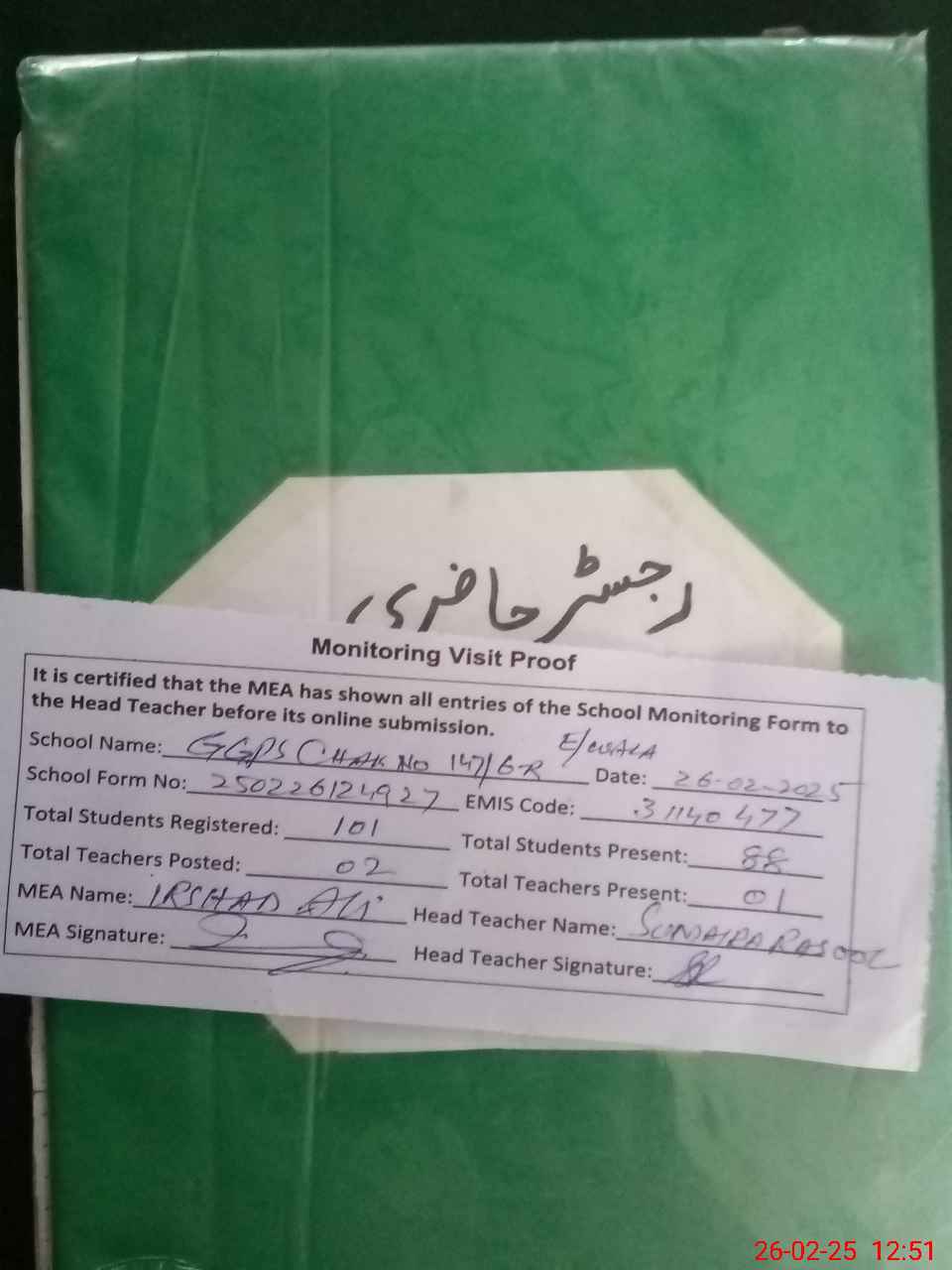| Attendance Register | Head Teacher | MEA with School | Visit Proof |
