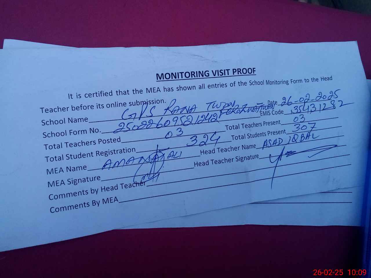 | Attendance Register | Head Teacher | MEA with School | Visit Proof |