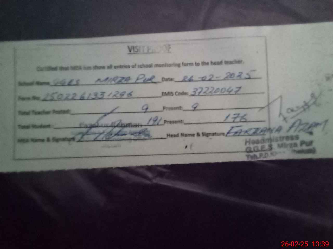 | Attendance Register | Head Teacher | MEA with School | Visit Proof |