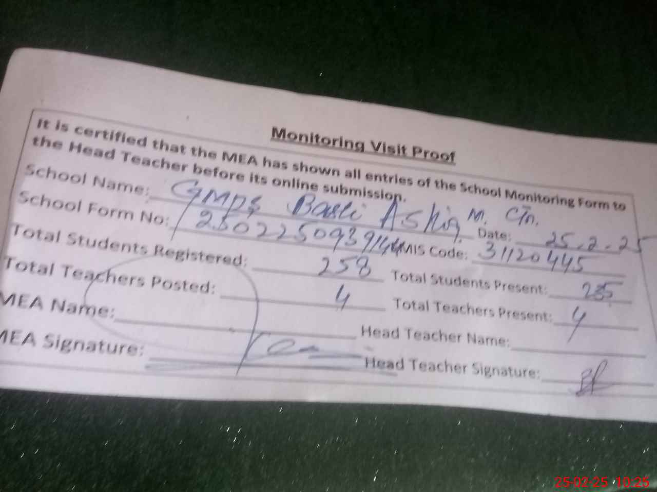 | Attendance Register | Head Teacher | MEA with School | Visit Proof |