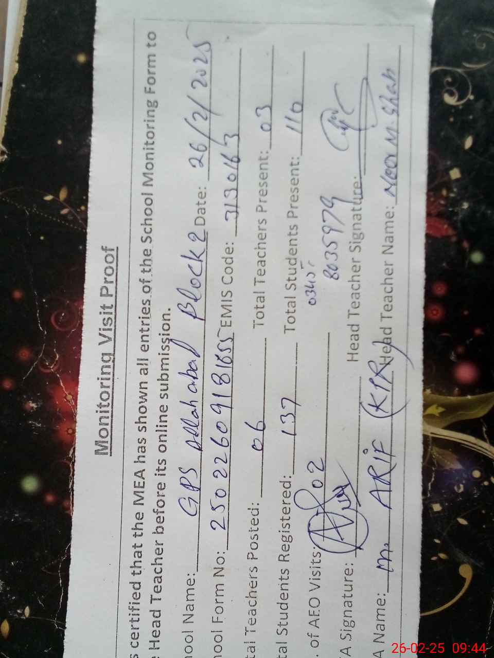 | Name: No**** Mu**** Sh**** Designation: (School Headmaster's/Headmistress's) PST Phone/Cell Number: 03**** |