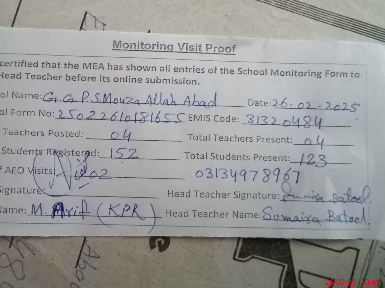| Attendance Register | Head Teacher | MEA with School | Visit Proof |