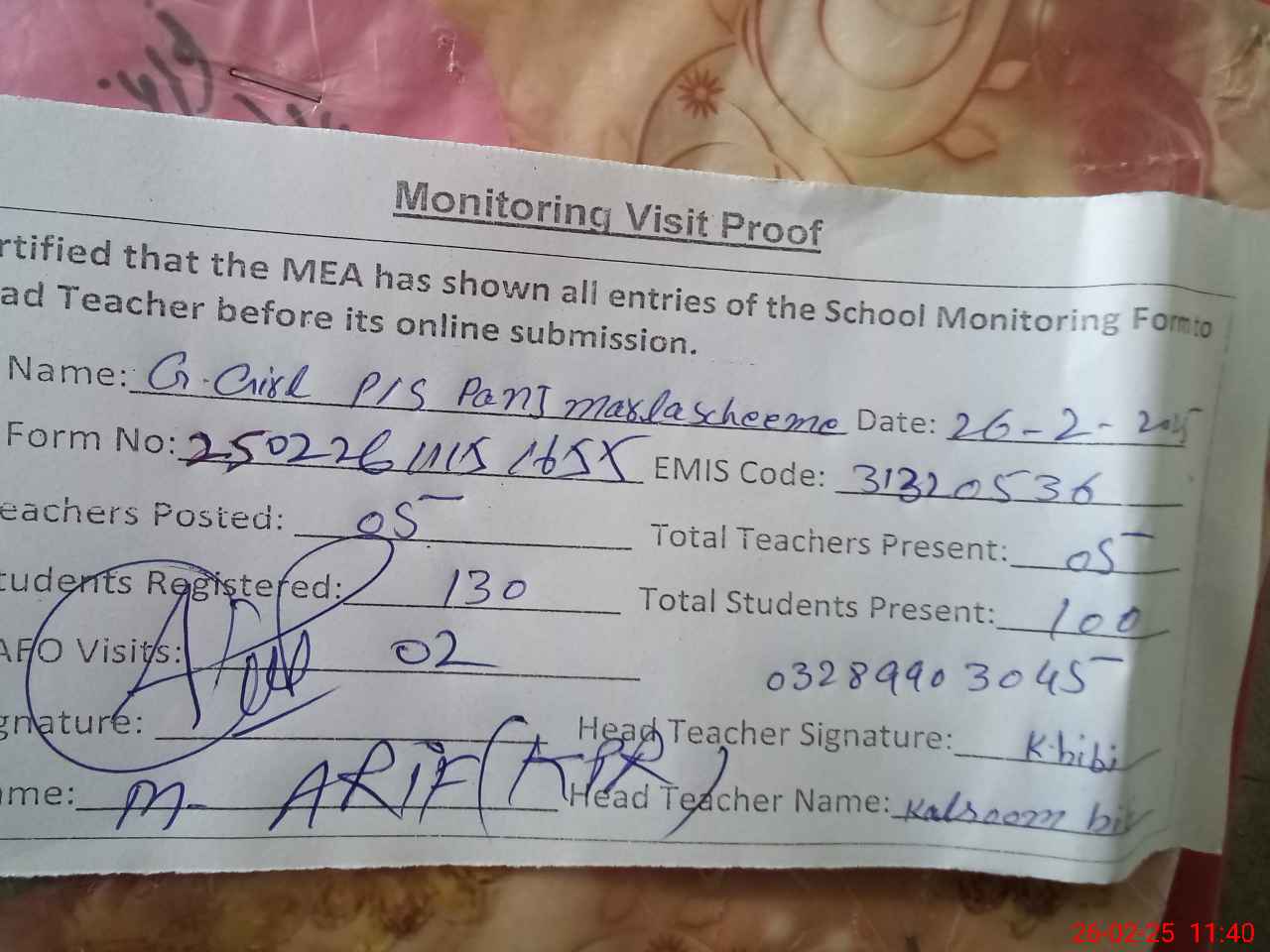 | Attendance Register | Head Teacher | MEA with School | Visit Proof |