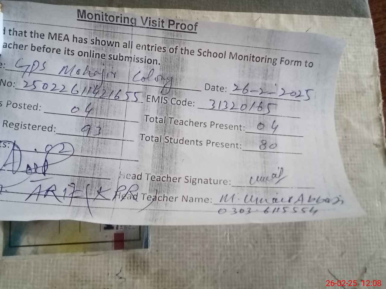 | Attendance Register | Head Teacher | MEA with School | Visit Proof |
