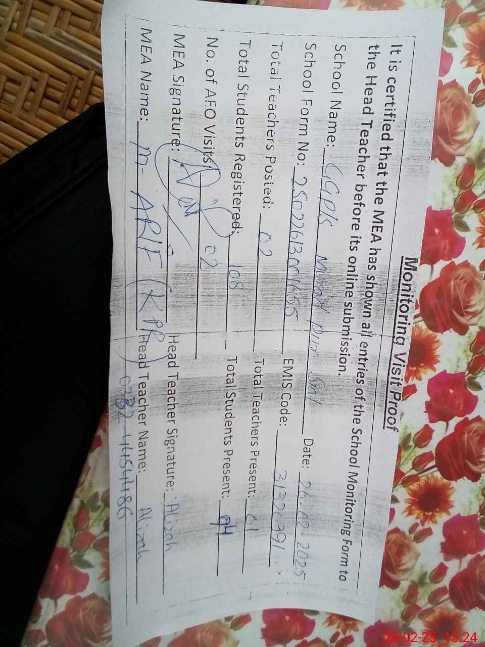 | Attendance Register | Head Teacher | MEA with School | Visit Proof |