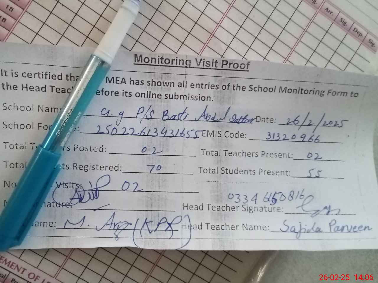 | Attendance Register | Head Teacher | MEA with School | Visit Proof |