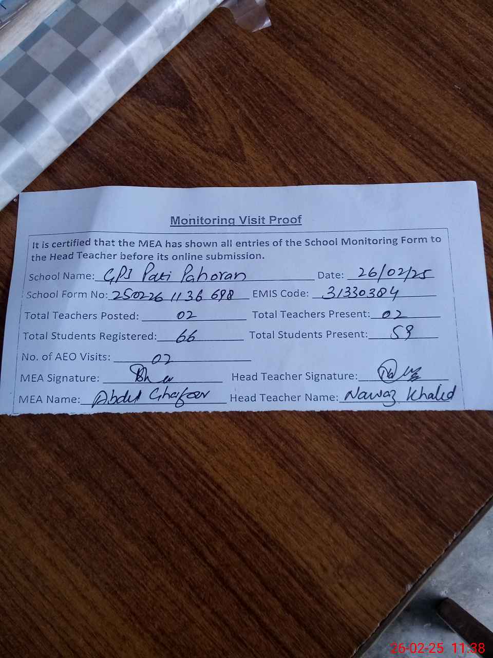 | Attendance Register | Head Teacher | MEA with School | Visit Proof |
