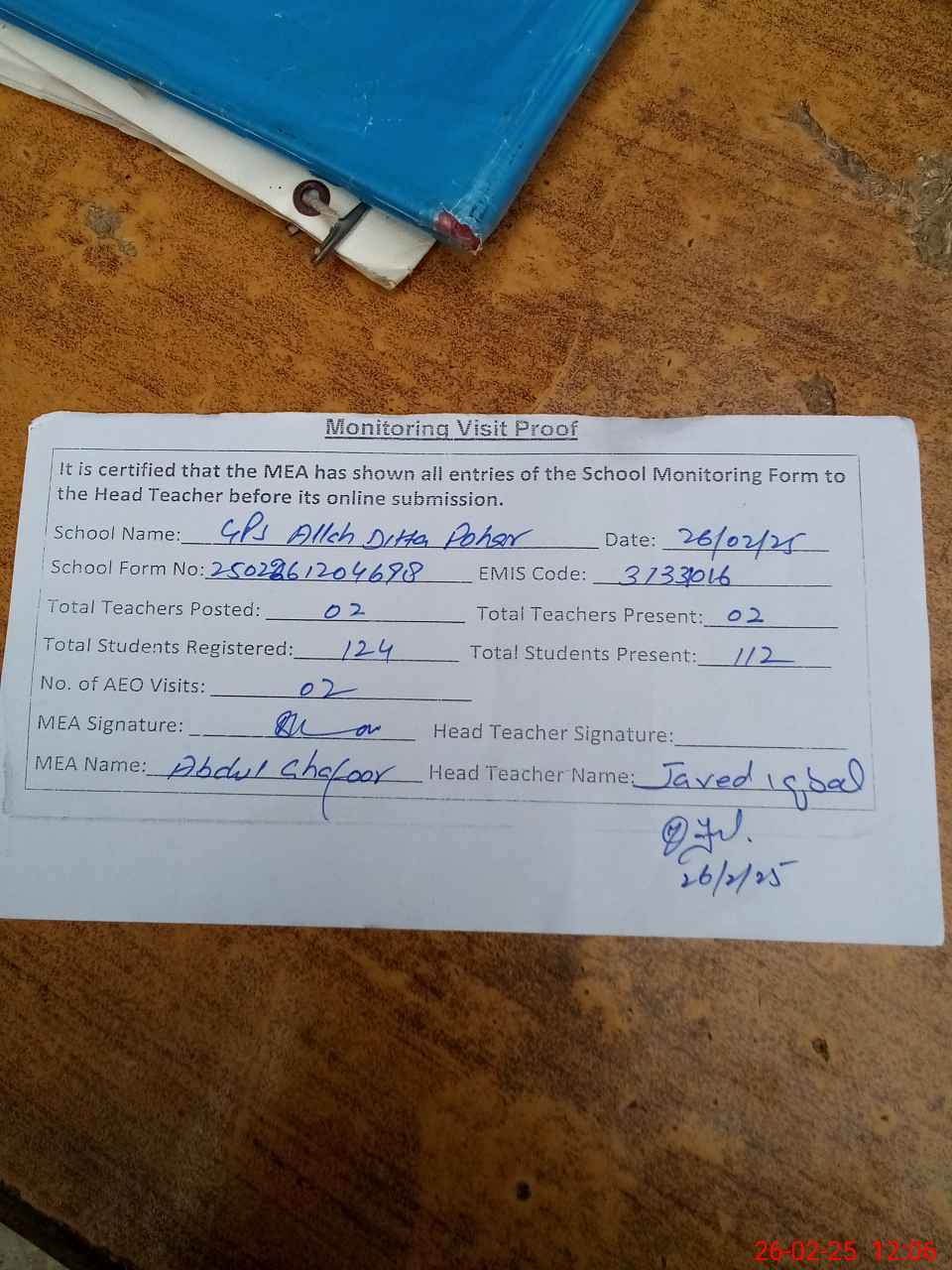 | EMIS Code: 31331016 | Name of School: GPS ALLAH DITA PAHOOR | |||
