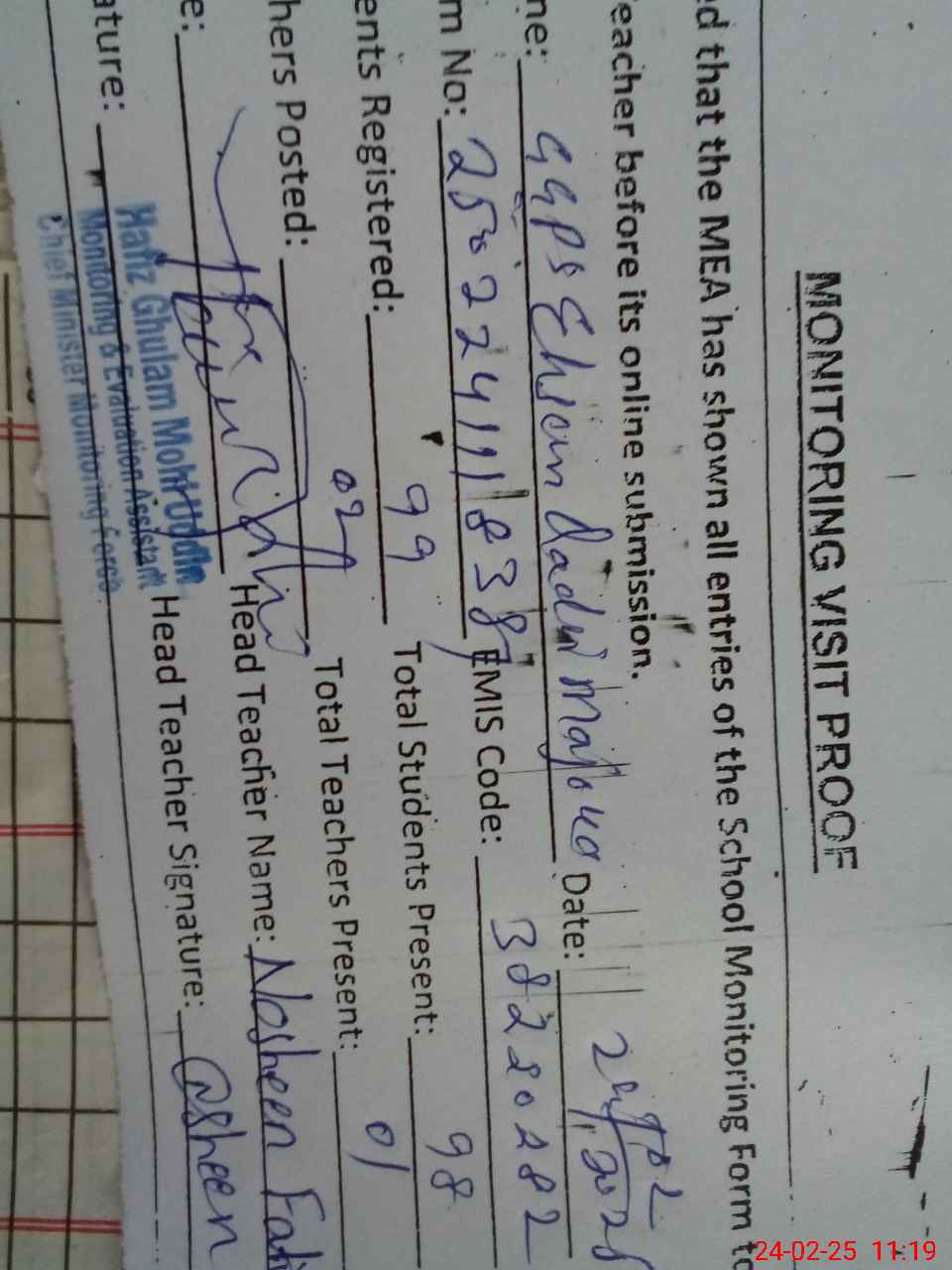 | EMIS Code: 38220282 | Name of School: GGPS EHSAN QADAR MAJOKA | |||