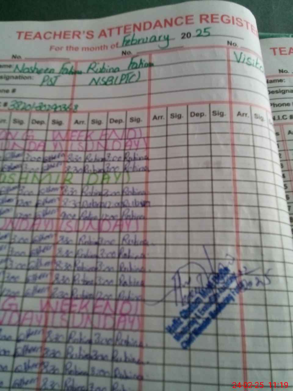 | CNIC | Full Name | Designation | R/C | Absence During Last Calender Month |