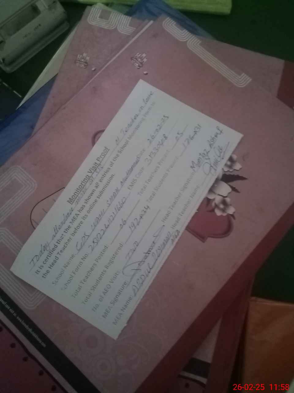 | Attendance Register | Head Teacher | MEA with School | Visit Proof |