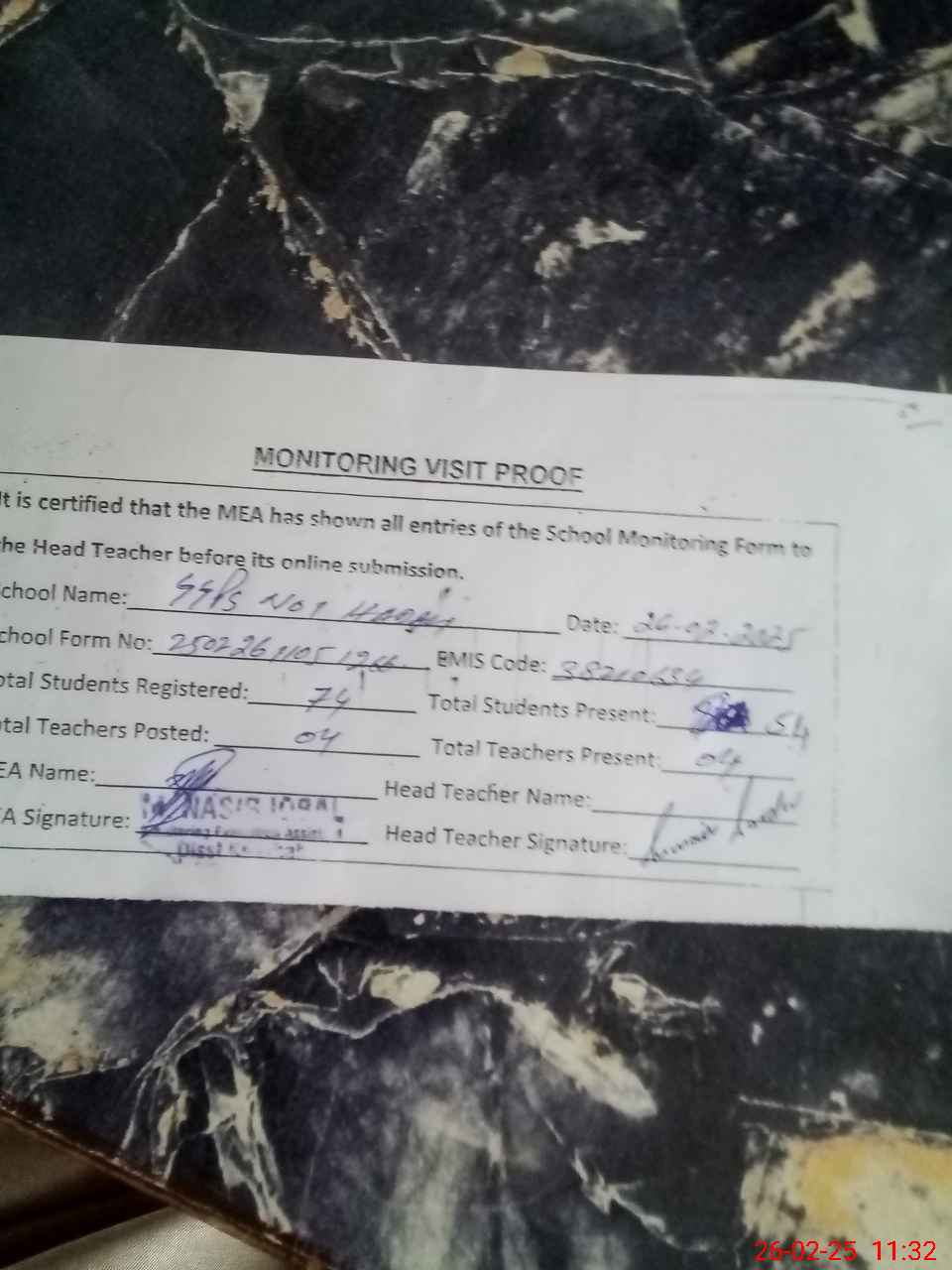 | Attendance Register | Head Teacher | MEA with School | Visit Proof |