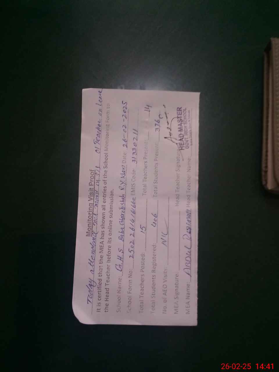 | Attendance Register | Head Teacher | MEA with School | Visit Proof |