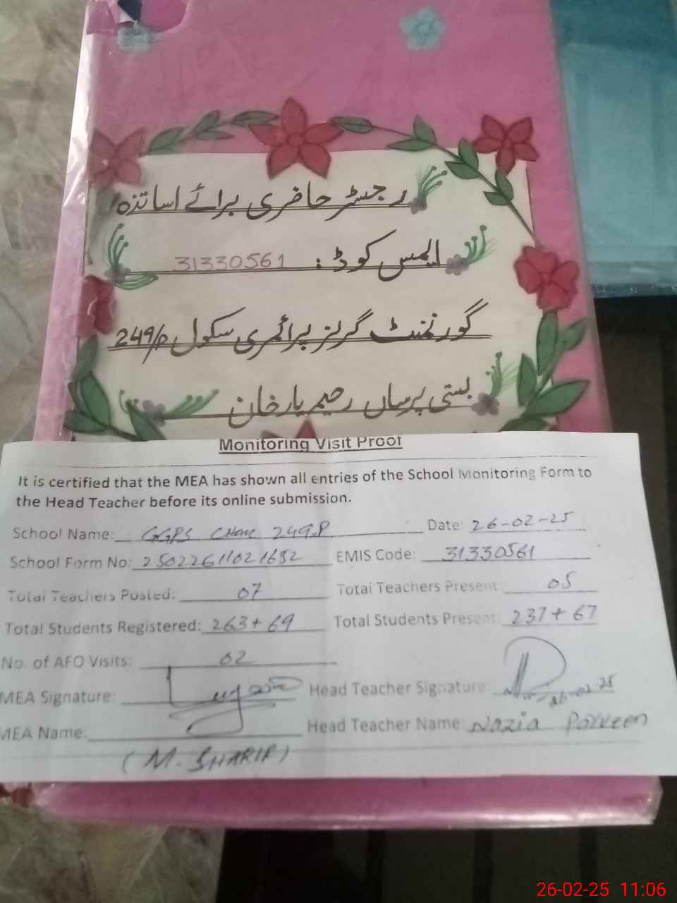 | Attendance Register | Head Teacher | MEA with School | Visit Proof |