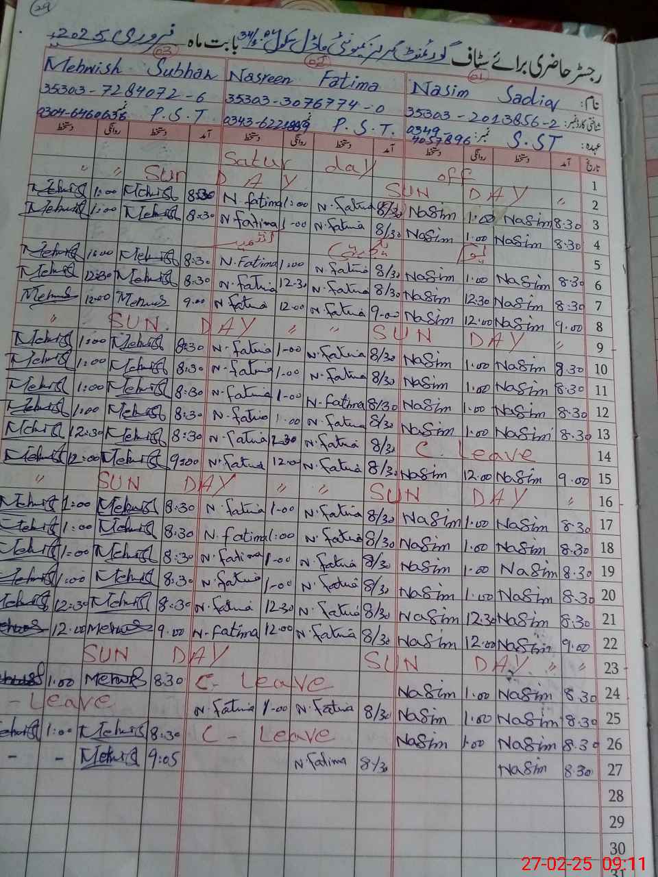 | CNIC | Full Name | Designation | R/C | Absence During Last Calender Month |