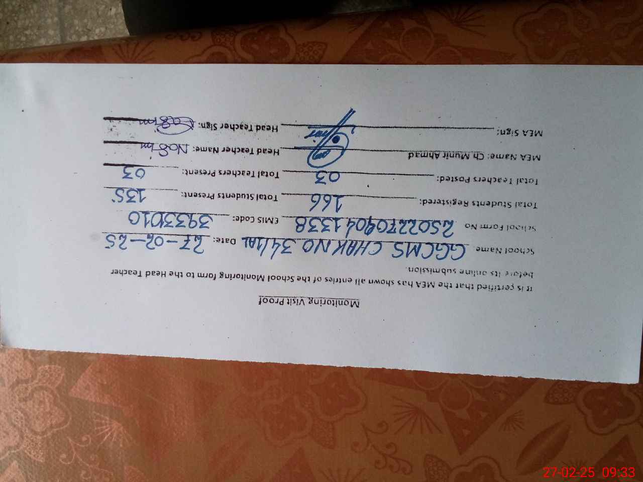 | Attendance Register | Head Teacher | MEA with School | Visit Proof |