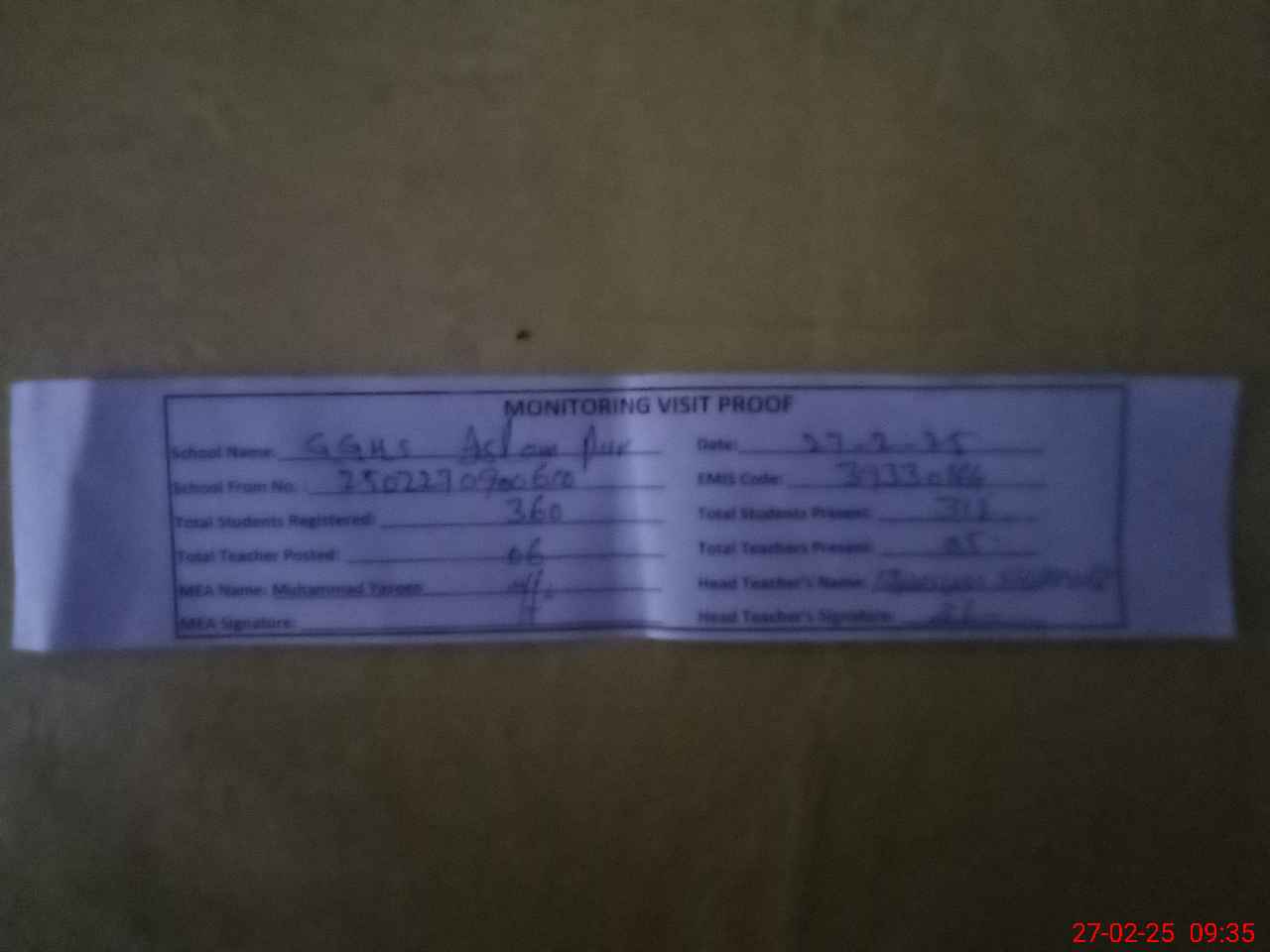 | Attendance Register | Head Teacher | MEA with School | Visit Proof |
