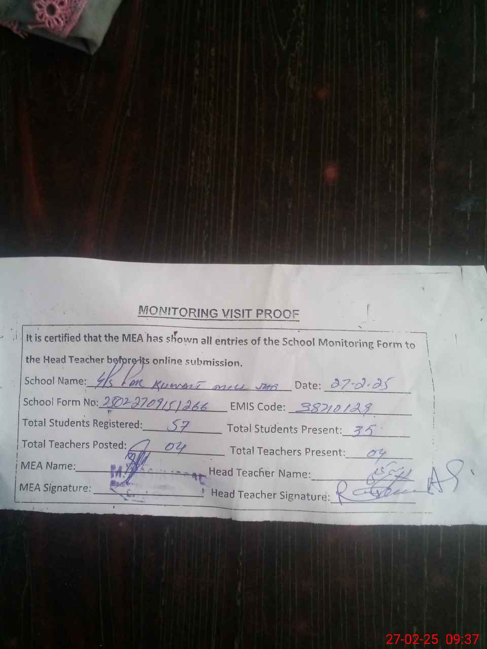 | Attendance Register | Head Teacher | MEA with School | Visit Proof |