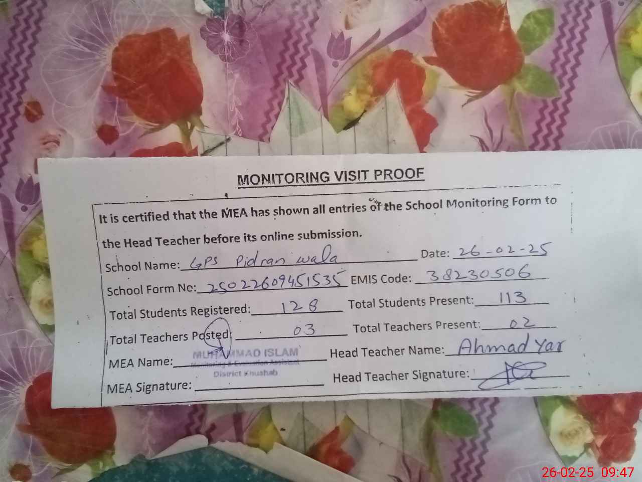 | Attendance Register | Head Teacher | MEA with School | Visit Proof |