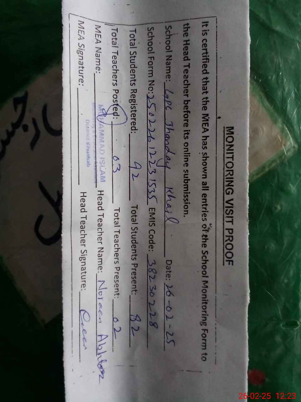 | Attendance Register | Head Teacher | MEA with School | Visit Proof |