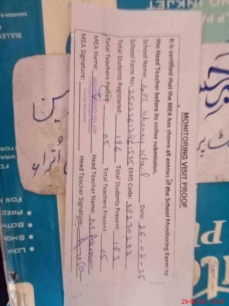 | Attendance Register | Head Teacher | MEA with School | Visit Proof |