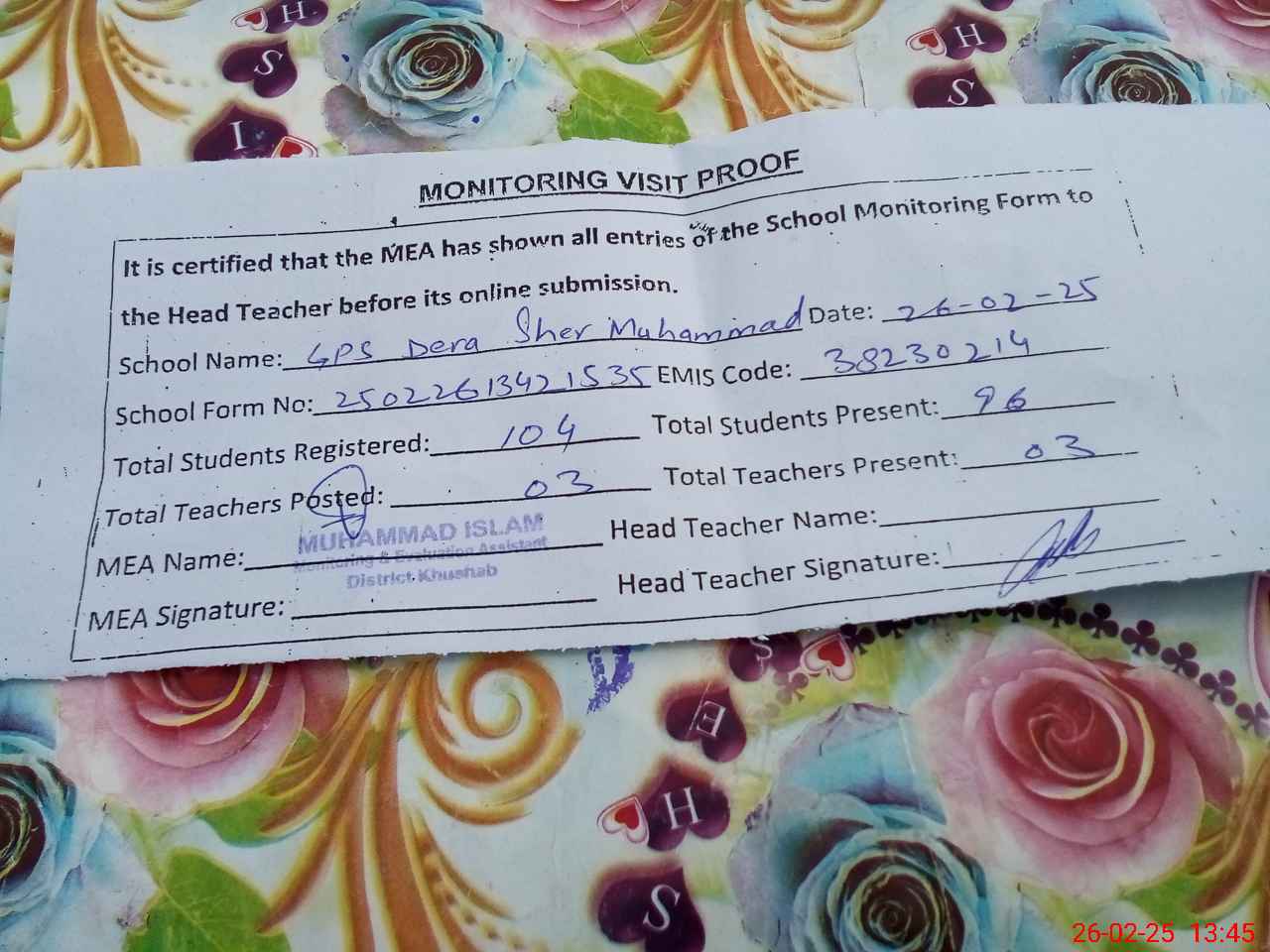 | Attendance Register | Head Teacher | MEA with School | Visit Proof |