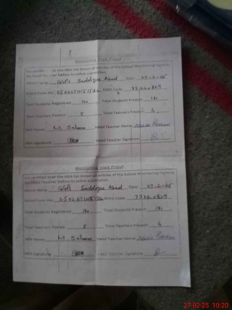 | EMIS Code: 33220829 | Name of School: GGPS SIDDIQUE ABAD | |||