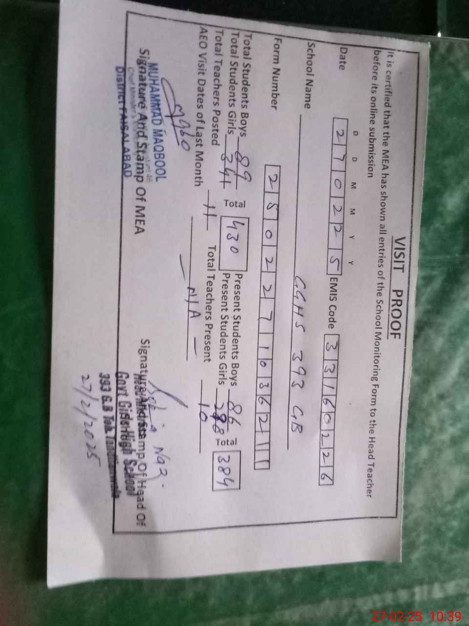 | Certified that this School was Inspected by the Undersigned MEA/DMO Today and the Information Stated Above is as Per Record. | |||||