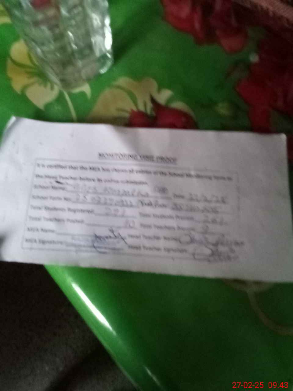 | Attendance Register | Head Teacher | MEA with School | Visit Proof |