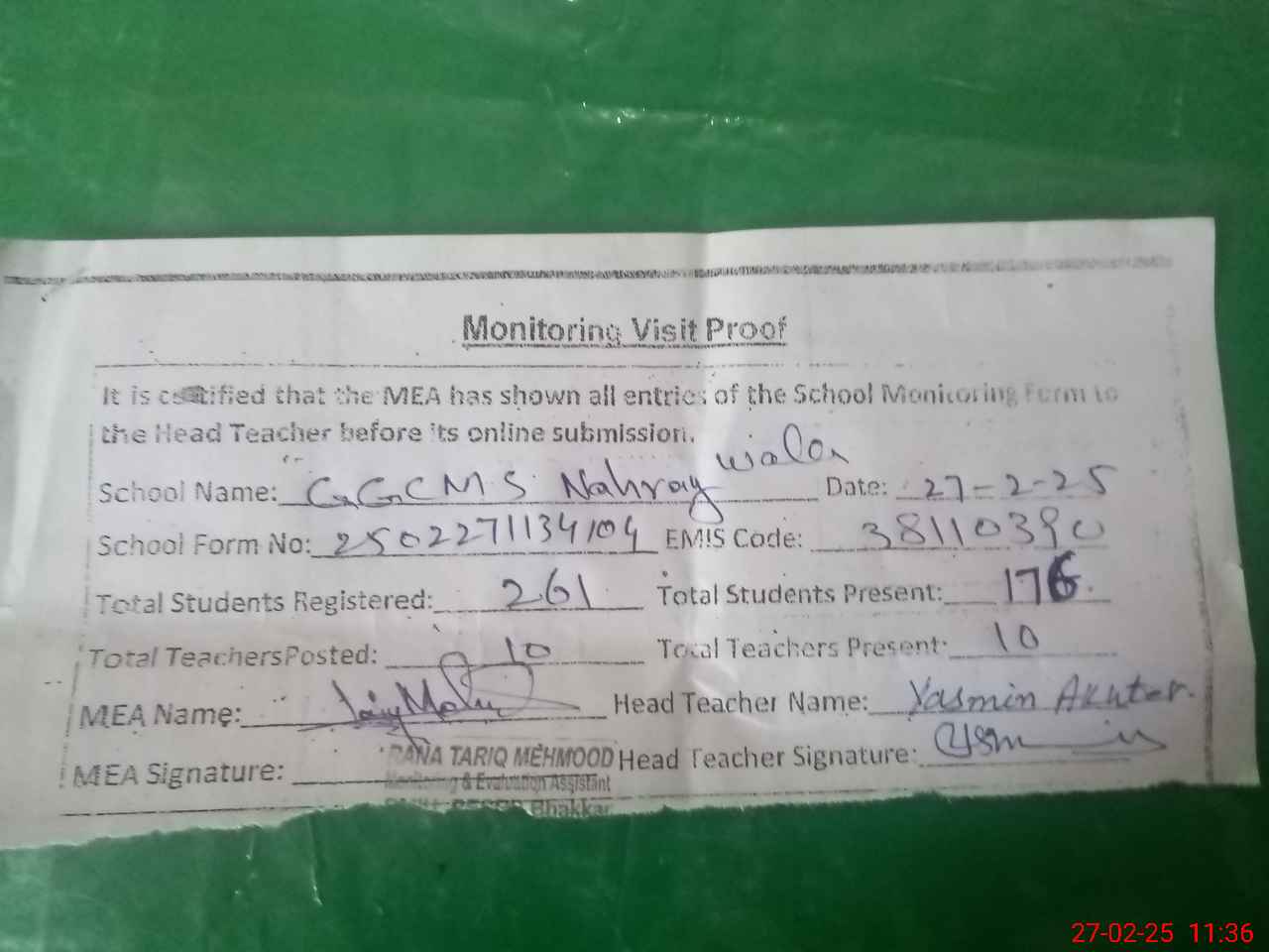 | Attendance Register | Head Teacher | MEA with School | Visit Proof |