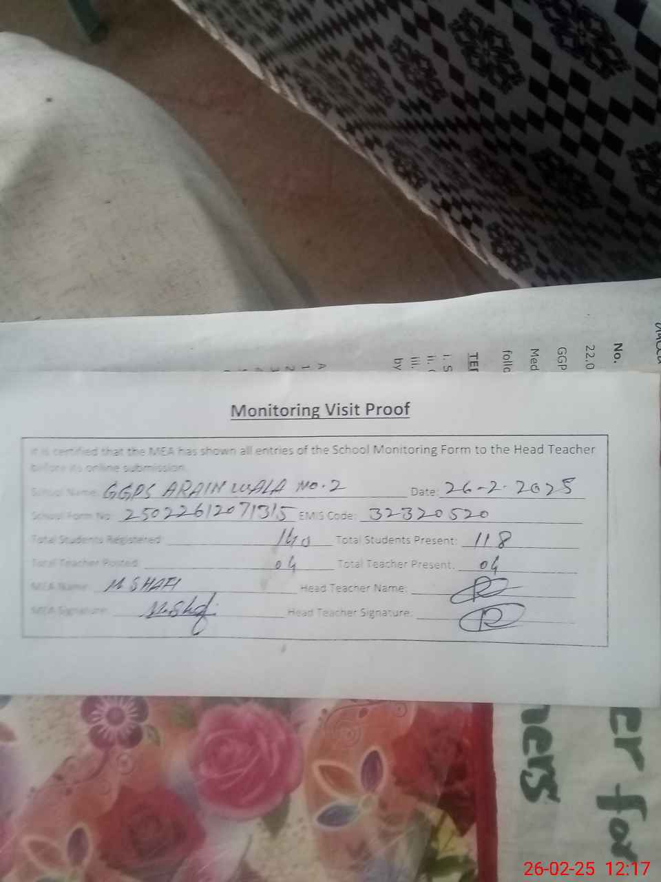 | EMIS Code: 32320520 | Name of School: GGPS ARAIN WALA NO.2 | |||