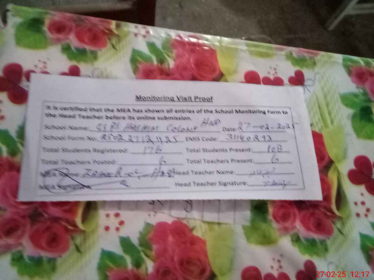 | Attendance Register | Head Teacher | MEA with School | Visit Proof |