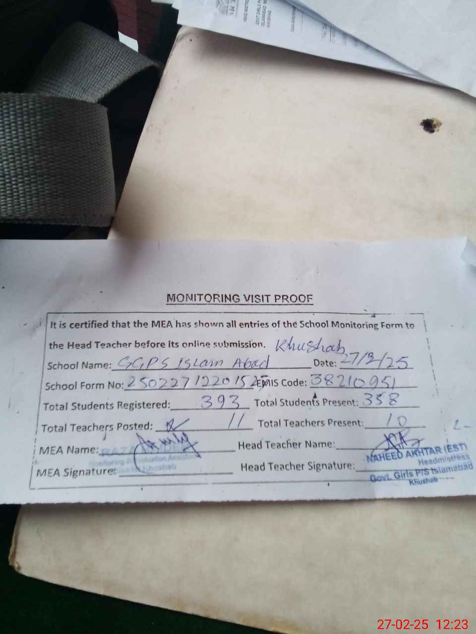 | Attendance Register | Head Teacher | MEA with School | Visit Proof |
