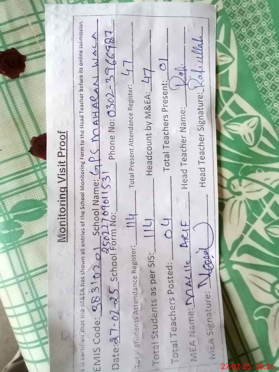 | Attendance Register | Head Teacher | MEA with School | Visit Proof |
