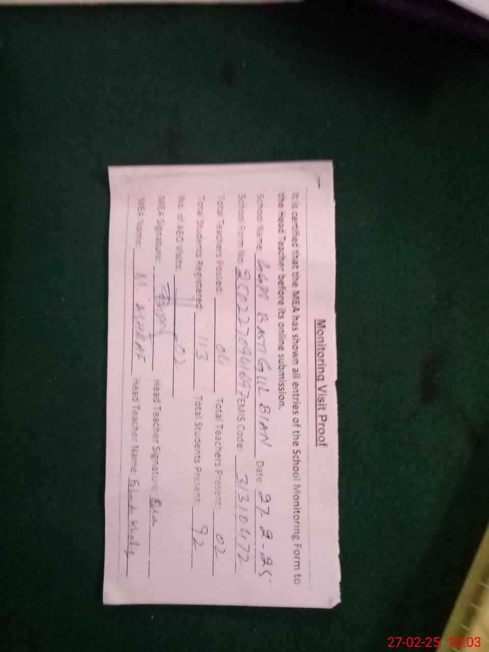 | Remarks (Use Separate Page if Required): ENROLMENT TAKEN FROM ATTENDENCE REGISTERS OF STUDENTS ATTENDENCE OF STUDENTS CARRYOUT BY HEAD COUNT AS PER MEAS SOP CLASS VERIFICATION OF CLASS V NOT UPLOADED AS PER ENROLLMENT OF SAID CLASS | |||||