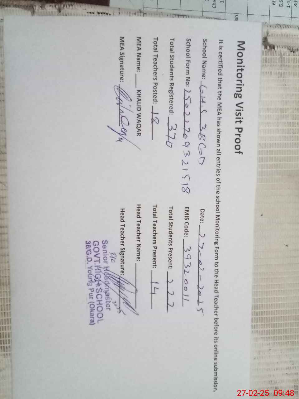 | EMIS Code: 39320011 | Name of School: GHS 38/G.D YOUNG PUR | |||
