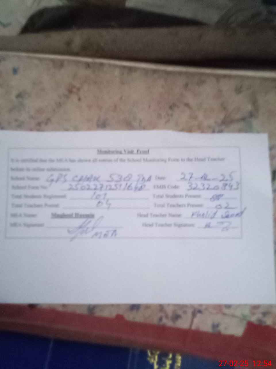 | Attendance Register | Head Teacher | MEA with School | Visit Proof |