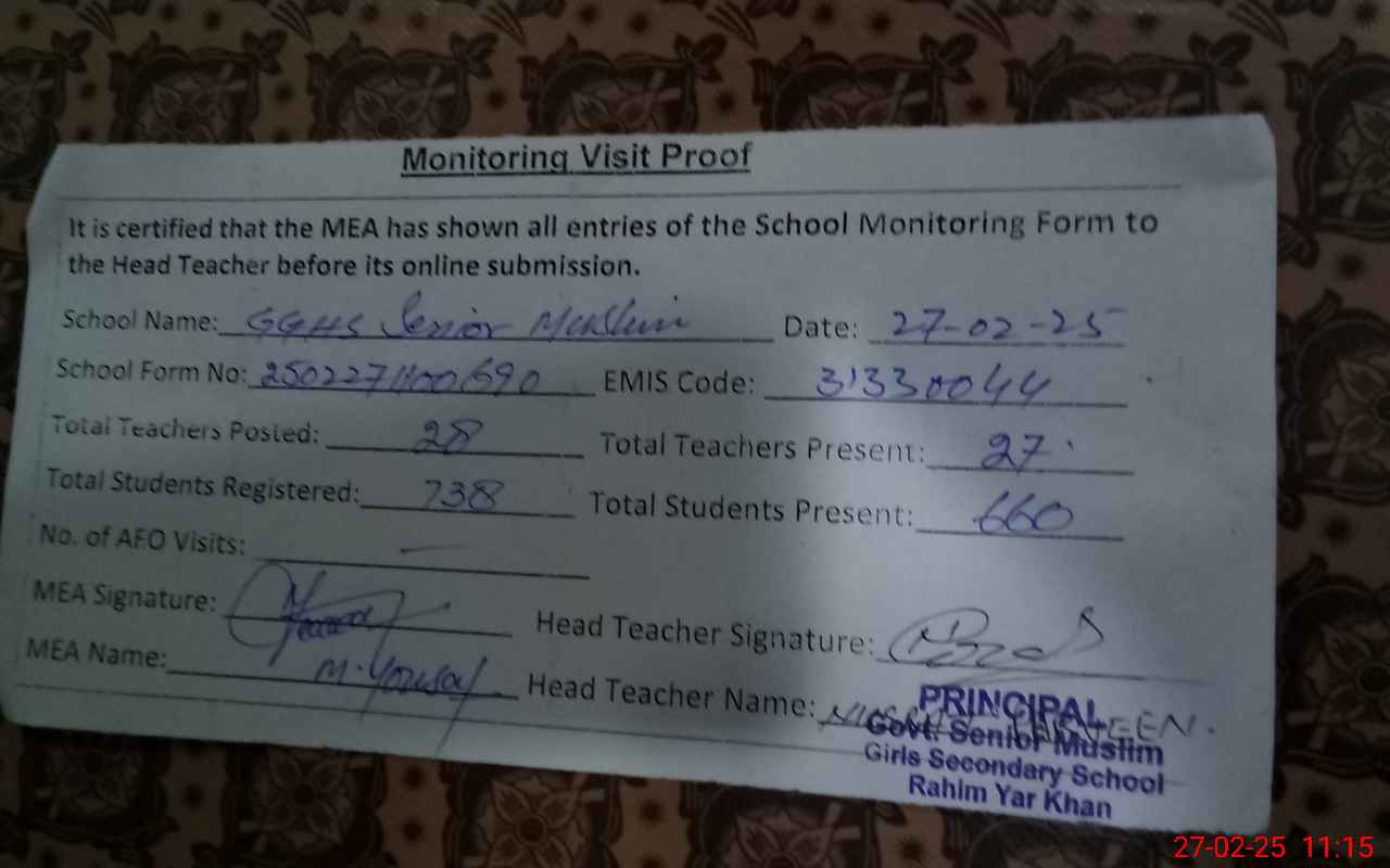 | Attendance Register | Head Teacher | MEA with School | Visit Proof |