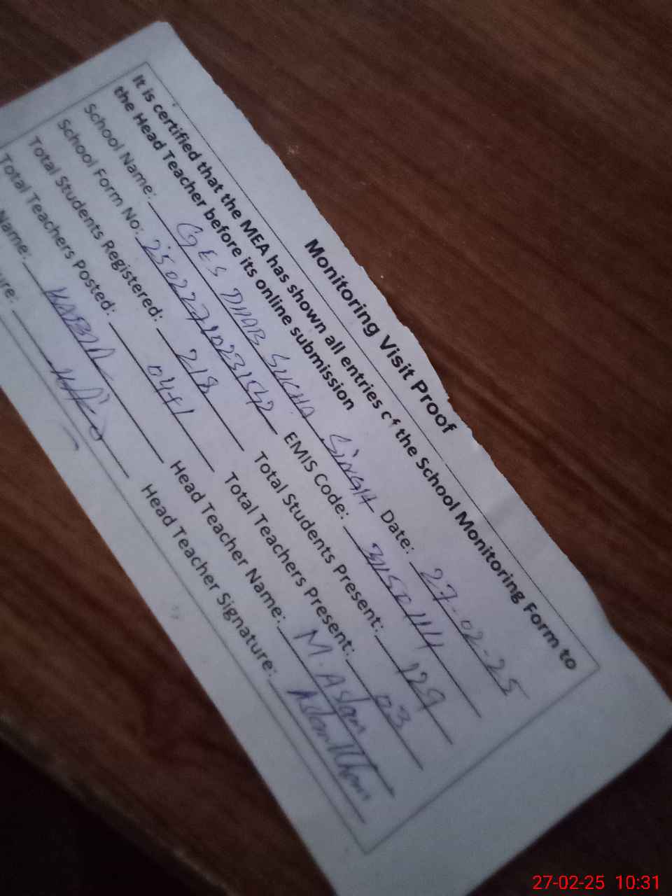 | Attendance Register | Head Teacher | MEA with School | Visit Proof |