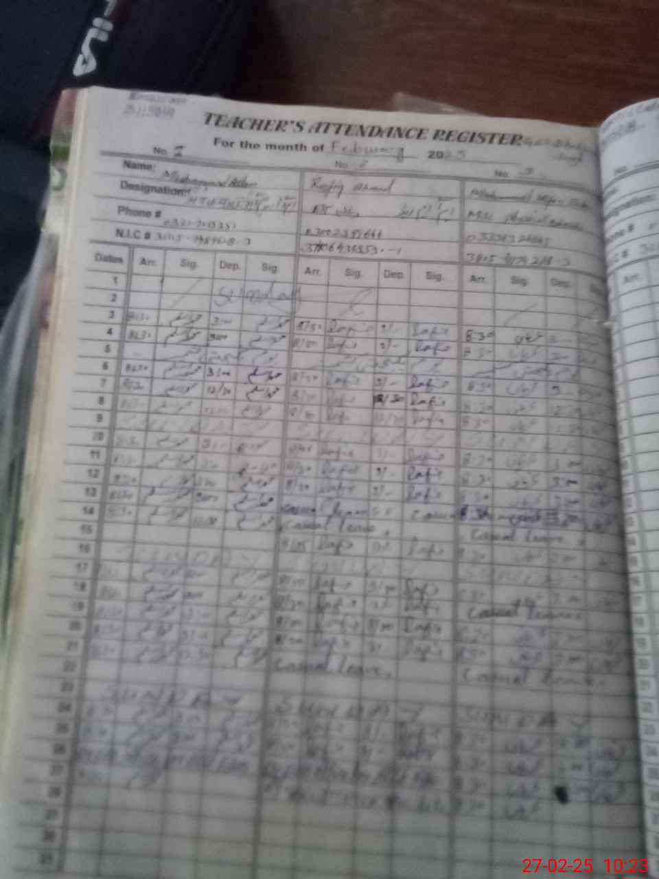 | CNIC | Full Name | Designation | R/C | Absence during last cal. month |