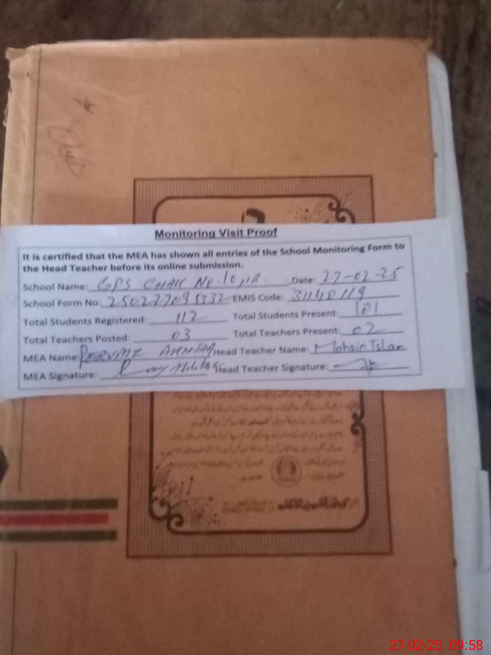 | Attendance Register | Head Teacher | MEA with School | Visit Proof |