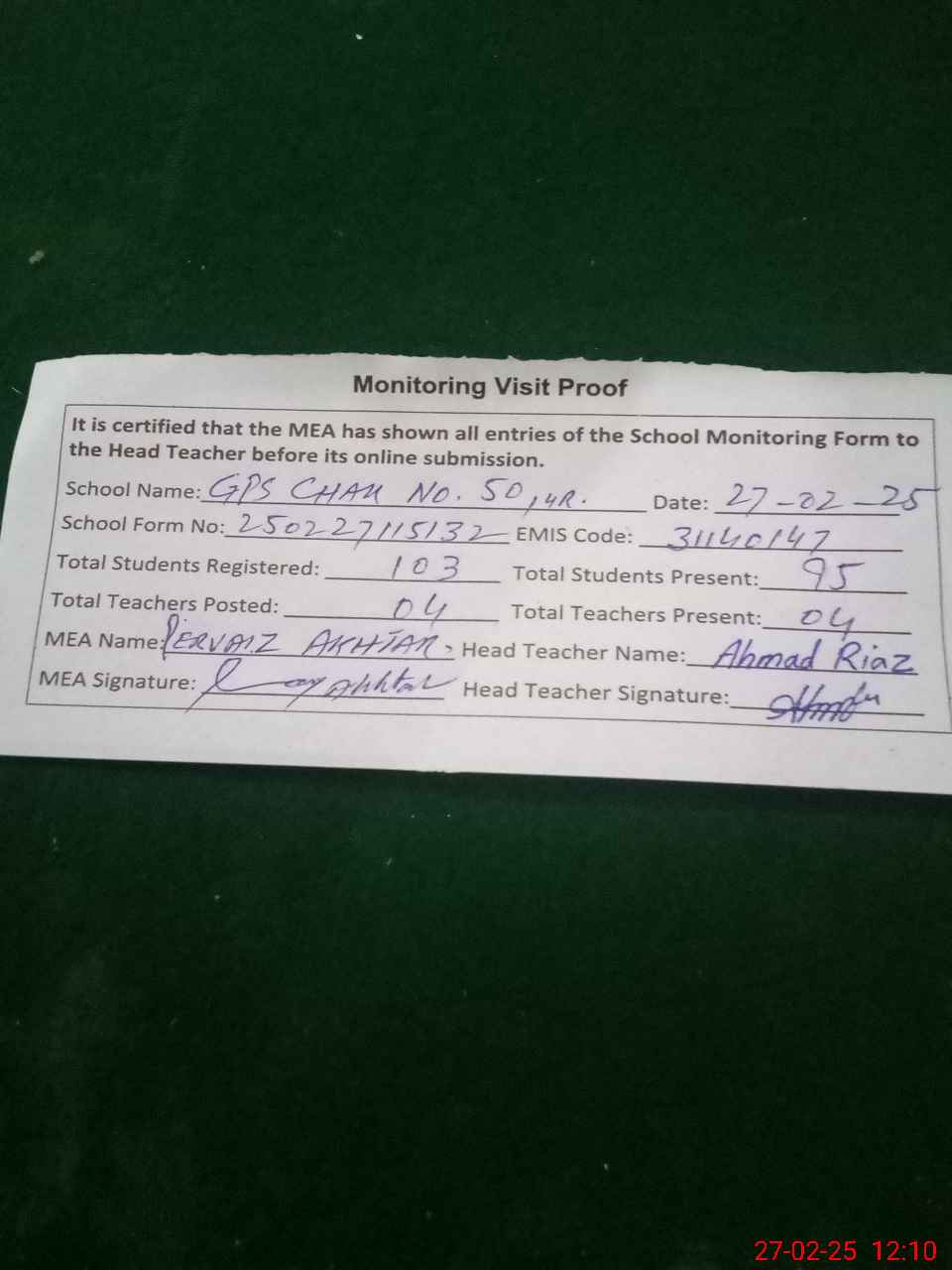 | EMIS Code: 31140147 | Name of School: GPS CHAK NO 50/4-R NO 2 | |||