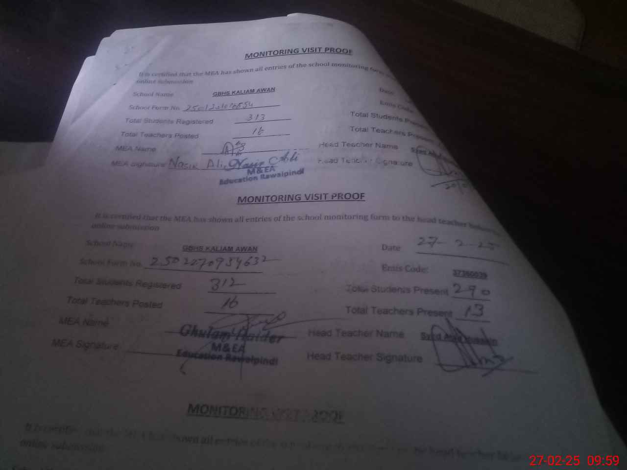 | Attendance Register | Head Teacher | MEA with School | Visit Proof |