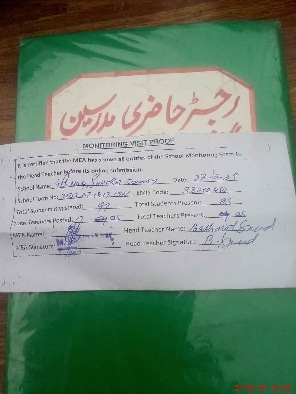 | Attendance Register | Head Teacher | MEA with School | Visit Proof |